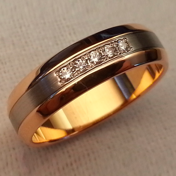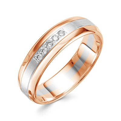 Кольцо из красного и белого золота 585 пробы по бесшовной технологии, выполненно в оригинальном фирменном стиле, который не оставит равнодушными самых искушенных. Средняя часть кольца матованная, с закрепленными дорожкой 5 бриллиантами 5 Кр 57 0,076 ct 3/5А (90-60), крайние элементы кольца из золота иного цвета, полированные, разделены с матованной частью четкими тонкими канавками.