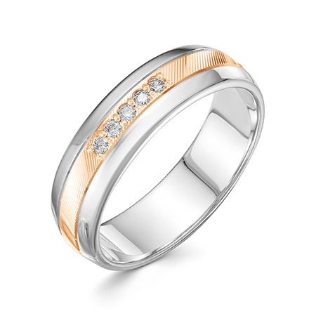 Кольцо изготовлено из белого и красного золота 585 пробы по бесшовной технологии. Среднюю часть кольца из красного золота украшают 5 бриллиантов 5 Кр 57 0,076 ct 3/5А (90-60), их блеск и игру подчеркивает алмазная насечка по всей поверхности среднего сегмента кольца. По бокам кольца равноширокие сегменты из белого полированного золота, отделенные тонкими нитевидными алмазными канавками по наружной поверхности кольца от средней части.