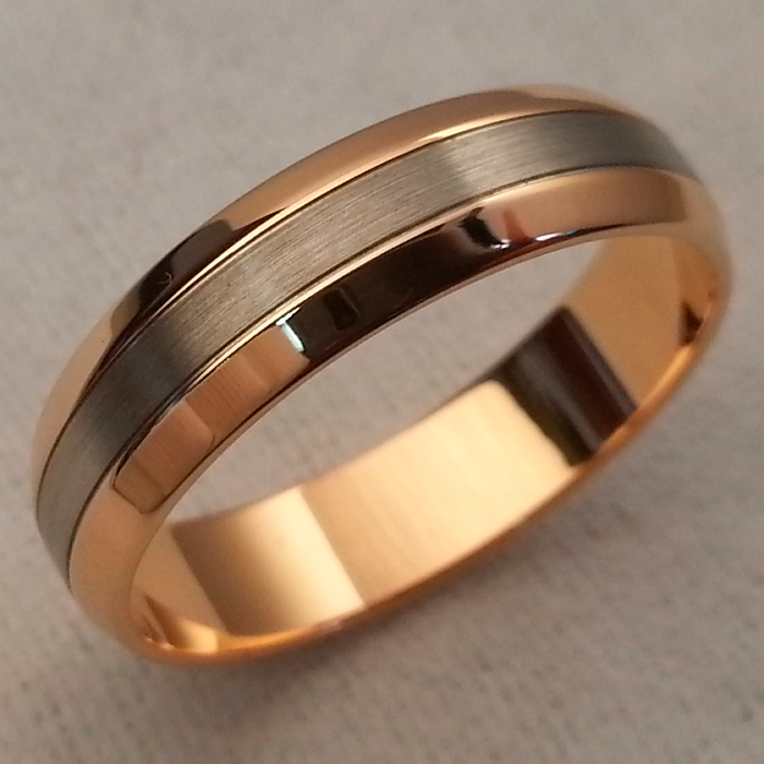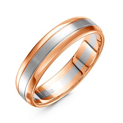 Кольцо изготовлено из красного и белого золота 585 пробы, без камней. Центральная часть колца матовая. Этот вид отделки создает интересное сочетание полированной и шероховатой поверхности. Сегменты кольца разделены тонкой нитевидной канавкой.