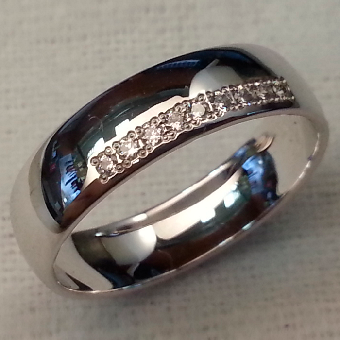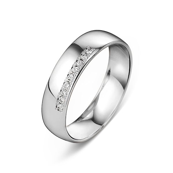 Кольцо изготовлено из белого прокатного золота 585 пробы. 9 бриллиантов 9 Кр 57 0,063 ct 3/5 А (200-120) оригинально закреплены дорожкой вдоль края шинки. Такое расположение драгоценных камней отличает эту модель обручального кольца от множества других, где камни закреплены посередине. Бухтированная (дефованная) форма шинки - вогнутое внутри, выпуклое снаружи.