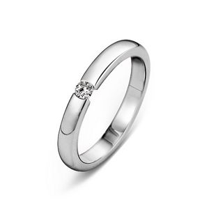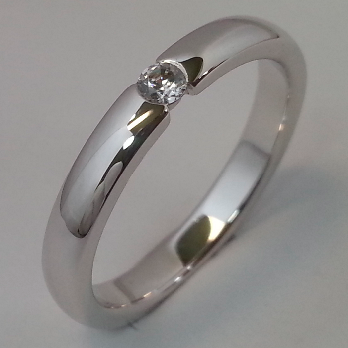 Кольцо изготовлено из белого прокатного золота 585 пробы. Камень 1 Кр 57 0,065 ct 3/5А (20-15) необычно закреплен: создается впечатление, что он зажат торцами шинки.