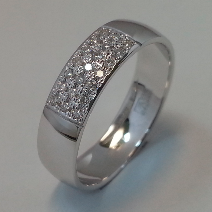Кольцо изготовлено из белого прокатного золота 585 пробы. В виде прямоугольника закреплен 21 бриллиант 21 Кр 57 0,084 ct 3/5А (400-200), с подрезкой. Форма этого обручального кольца сформирована по технологии бухтирования (дефованная шинка), что позволило снизить вес (и, соответственно, цену), при этом сохранив неизменной ширину.